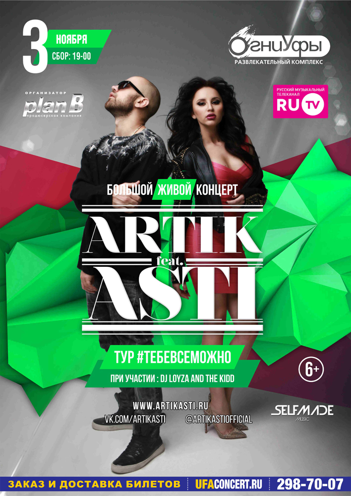 Песни молодежного коллектива «Artik & Asti“, состоящего из вокалистки — Asti и саунд-продюсера, автора и композитора — Artik'а, уже который год уверенно взрывают практически все музыкальные хит-парады страны."Artik & Asti» — яркий пример self made проекта в музыкальном бизнесе. Наверное, поэтому их успех исчисляется невероятной гастрольной востребованностью. Группа дает концерты в абсолютно разных уголках нашей родины и за рубежом.