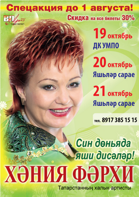 Концерт самой популярной и известной, любимой и несравненной, простой и в то же время великой — народной артистки Татарстана Хании Фархи! 19 октября в ДК УМПО, 20 и 21 октября 2016 года во Дворце Молодежи она представит уфимцам свою новую программу " Син дөньяда яши дисәләр...». Хания Фархи вкладывает душу в каждое свое исполнение, ее песни всегда пронизаны искренностью, нежностью и жизненностью. Песни льются из ее уст как и поется в ее самой популярной песне «Элдермешкэ кайтам эле» как чистый звонкий родник. У нее на концерте зритель чувствует себя как дома, она и ее популярный ансамбль «Байрам», который состоит из молодых талантливых парней, всегда выкладываются на 100% и всегда с уважением относятся к своим зрителям. Вот уже более 25 лет она на сцене и в этот раз Хания Фархи также будет дарить своим слушателям тепло, радость и любовь, новые песни и старые хиты! Добро пожаловать на самый душевный и лучший концерт осени! Тем, кто покупает билет до 1 августа, по специальной акции действует 30% скидка!