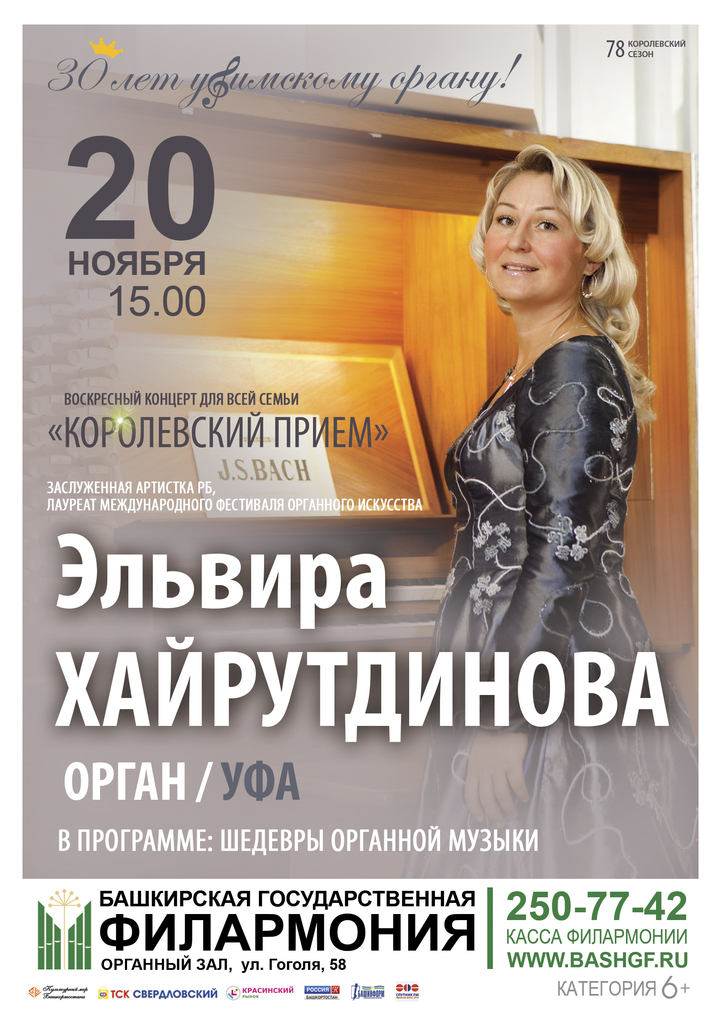 В Органном зале Башкирской государственной филармонии им. Х. Ахметова пройдет концерт заслуженной артистки РБ, лауреата Международного фестиваля органного искусства ЭЛЬВИРЫ ХАЙРУТДИНОВОЙ.