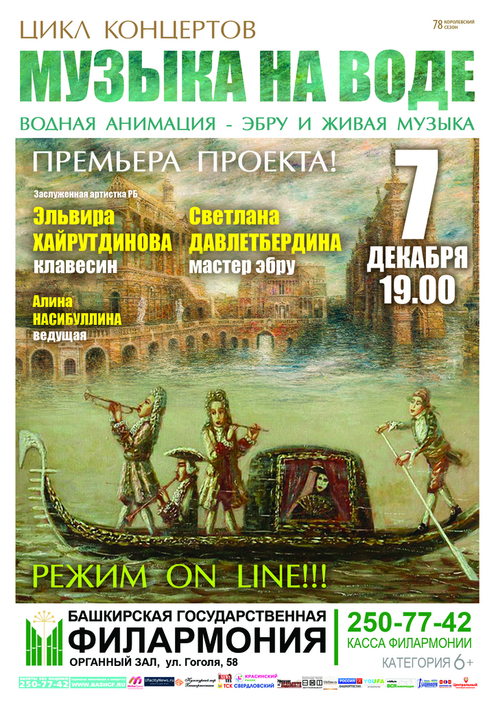 7 декабря в 19 часов вас ждет встреча с уже полюбившимся проектом, который объединил музыку и технику эбру. «МУЗЫКА НА ВОДЕ» — такое романтическое название получил этот цикл концертов в предстоящем сезоне. В этот вечер вас ждет встреча с клавесинной музыкой и ее исполнительницей Эльвирой ХАЙРУТДИНОВОЙ. В режиме on line под властью водной стихии мастер эбру Светлана ДАВЛЕТБЕРДИНА представит композиции, иллюстрирующие музыкальные сочинения. Ведущая — лектор-музыковед Алина НАСИБУЛЛИНА.