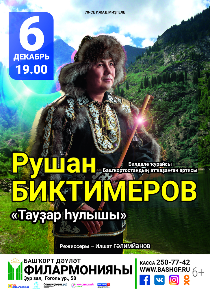 6 ДЕКАБРЯ состоится сольный концерт заслуженного артиста Республики Башкортостан Рушана БИКТИМИРОВА «ДЫХАНИЕ ГОР». Артист — один из популярных и ярких молодых кураистов, нашедший себя в глубоком проникновении в национальную культуру. Музыкант исполняет на курае не только традиционную музыку, но и мелодии башкирской, зарубежной эстрады, классические произведения.