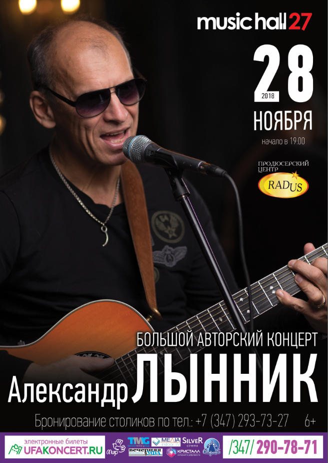 Ждём Вас на концерте, в одном из самых культовых мест Уфы, в «Мюзик Холл27» с вашими близкими и друзьями, и вы в очередной раз убедитесь, что творчество Александра Лынника того стоит!!!