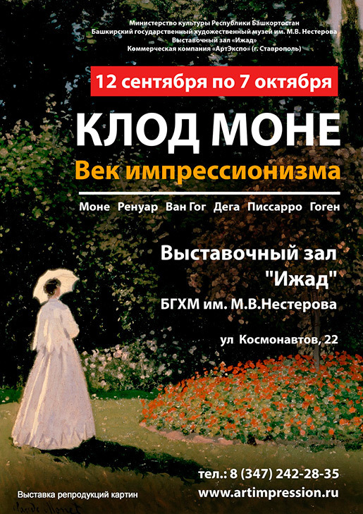 Жители и гости города приглашаются познакомиться с творчеством Винсента Ван Гога, Клода Моне, Камиля Писсарро и Пьера Огюста Ренуара, Поля Гогена, Эдгара Дега в виде репродукций картин на холсте в оригинальных размерах.