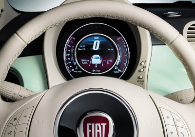 Салон обновленного Fiat 500 оснащается новой цифровой приборной панелью с 7-дюймовым дисплеем совмевстной разработки Fiat и Magneti Marelli. Помимо этого, для хэтчбека доступны новые варианты внутренней отделки.