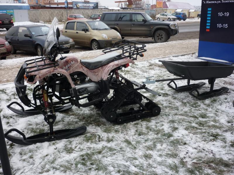 | Ещё пара слов: | Наш сайт http://aleks-cs900638.tiu.ru Cнегоболотоход сделан на базе квадроцикла Apache с 4-тактным двигателем объемом 180 кубических сантиметров, аналог двигателя YAMAHA. Cнегоболотоход имеет уникальную возможность передвигаться как летом на колесах 10», так и зимой при помощи двух траков которые прилагаются в комплекте вместе с ним, ширина гусеницы одного трака составляет 25,5 см, что дает возможность держаться на поверхности снега. Так же снегоболотоход укомплектован двумя лыжами (схожими по размеру от снегохода Тайга), электростартером, кикстартером, гнездом прикуривателя, прицепным устройство как для саней зимой так и для прицепа в летнее время, обогревом ручек (два положения), ветровым стеклом, двумя комплектами цепей и звезд что дает возможность менять передаточные числа при переоснащении вашего квадроцикла в снегоход. Время переустановки летнего варианта на зимний занимает не более получаса. Эксплуатация круглый год! |