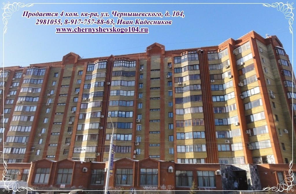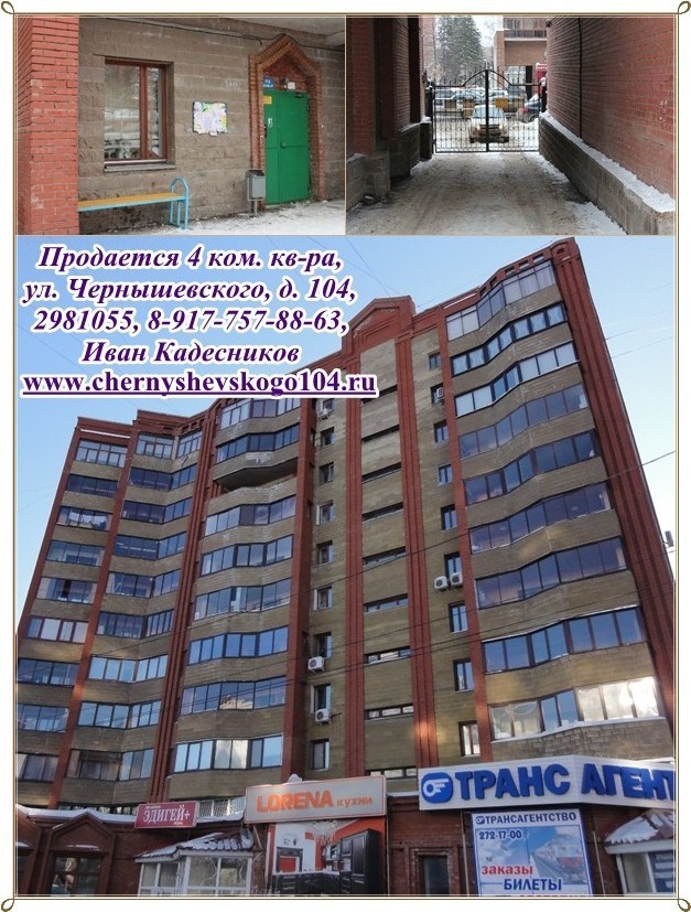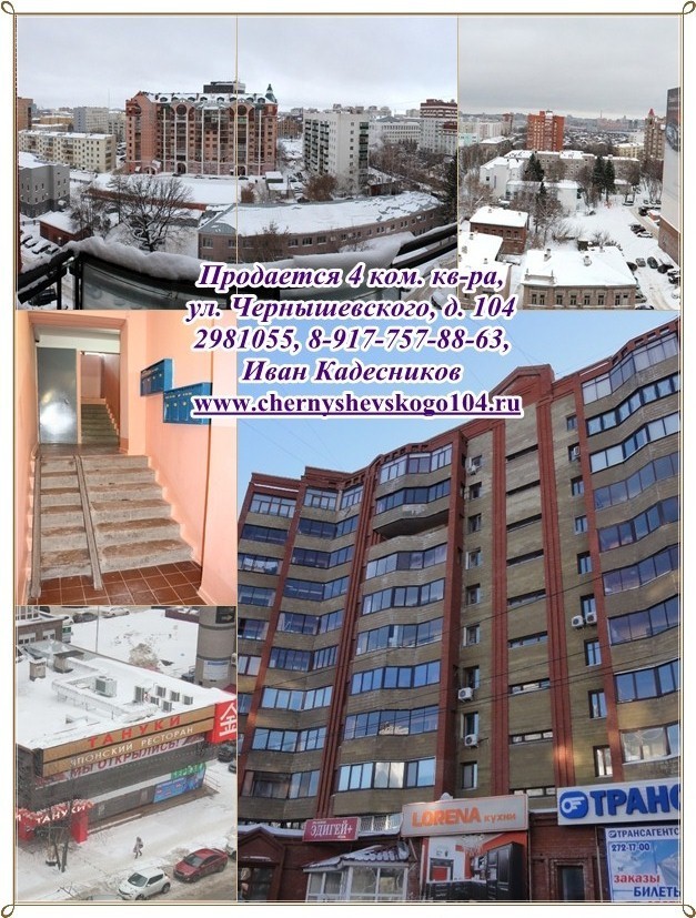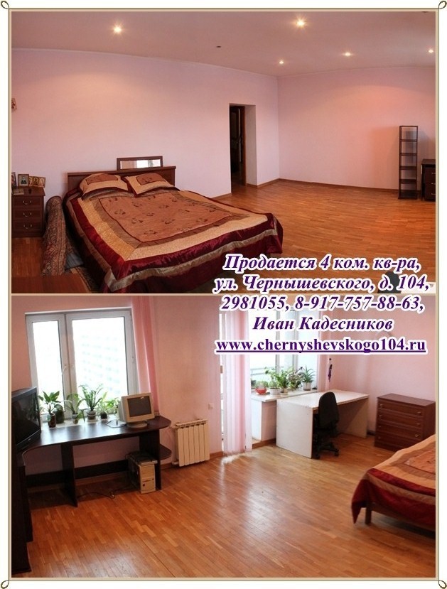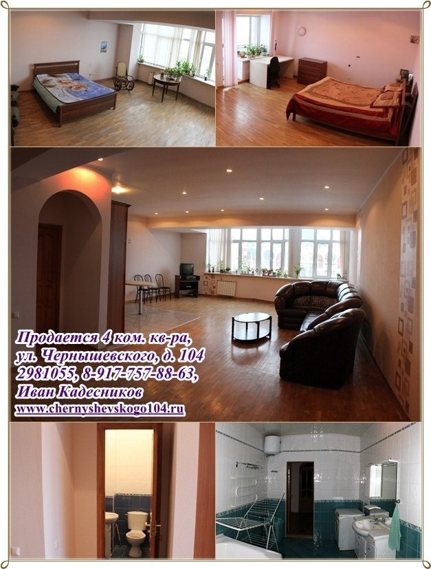 Продается 4х комн. квартира в центре, ул. Чернышевского 104, 11/11 кирп., 185/134/19, высота потолков 3 - 3,3 м, комнаты очень просторные, светлые, с панорамным остеклением. Двор огорожен, закрыт (охрана, видеонаблюдение). Во дворе спортивная и детская площадки. Комната 30 кв.м: 2 окна, на полу паркет, окна пластиковые, 3х камерные, балкон во двор. Комната 40 кв.м: отдельная гардеробная комната с гардеробной мебелью, окна витражные во всю стену (комната соединена с лоджией и утеплена на момент строительства, т.е. все узаконено). Комната с большим панорамным обзором. Зал объединен с кухней - 64 кв.м: окна витражные во всю ширину комнаты, поэтому создается впечатление необъятных просторов, одновременно с тишиной, т.к. окна смотрят во двор. Встроенная итальянская кухня, встроенная техника: посудомоечная машина Zanussi, холодильник Ariston, на полу керамогранит. Три санузла: один подготовлен под сауну (душевая кабина); второй санузел большой 9,3 кв.м, теплый пол, итальянская плитка, унитаз, биде, водонагреватель 50 литров; третий гостевой. Сверху есть тех. этаж. Чистая продажа. Деловой район города, развитая инфраструктура, рядом школы-гимназии №3 и №39, ДК Нефтяник, Гостиный двор, к/т, банки, рестораны, салоны красоты, сквер Маяковского, бассейн Буревестник. Рядом улицы: Цюрупа, Крупской, Кирова, Худайбердина, Мустая Карима, Коммунистическая, Октябрьской Революции, Советская, Пушкина. Фото, видео, 3D тур, 3D планировка на персональном сайте http://chernyshevskogo104.ru/ т. 298-10-55, 8-927-921-77-89, 8-917-757-88-63 Иван Кадесников
