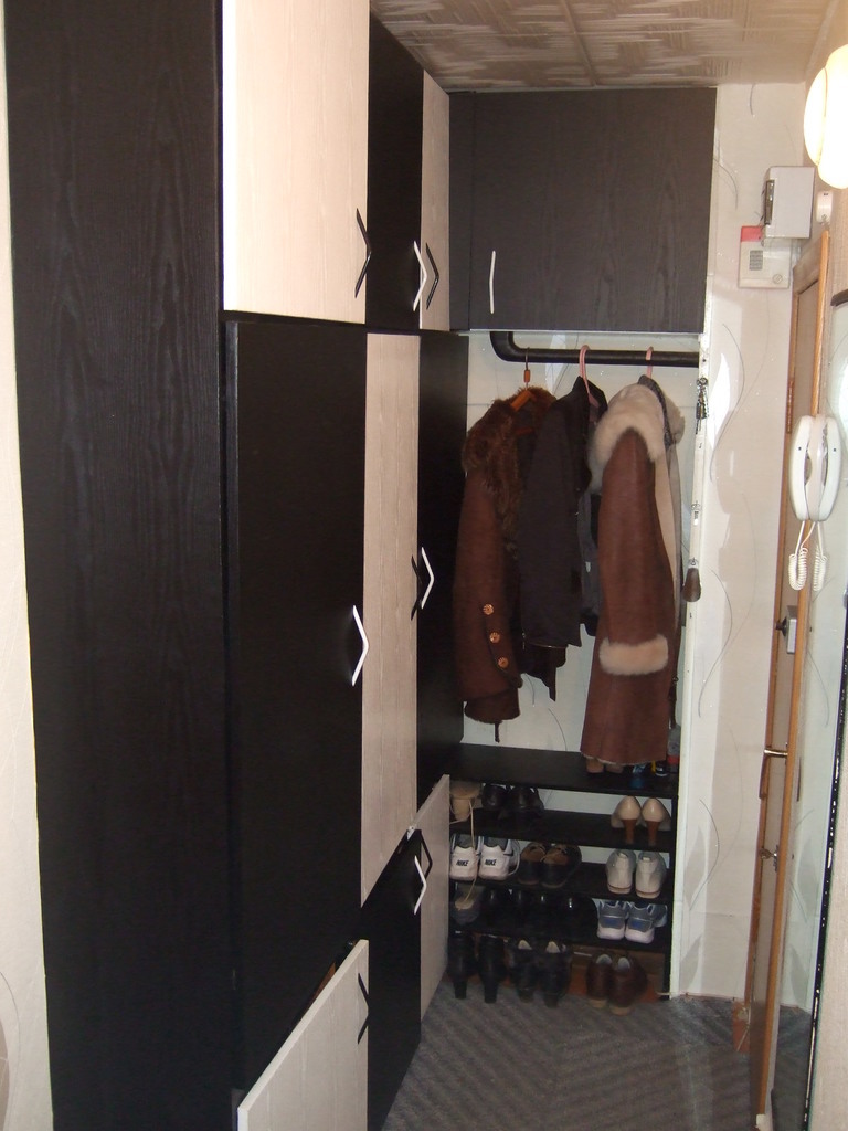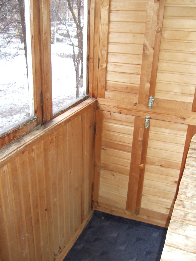 Балкон застеклен, обшит деревом, оборудован удобными шкафчиками.