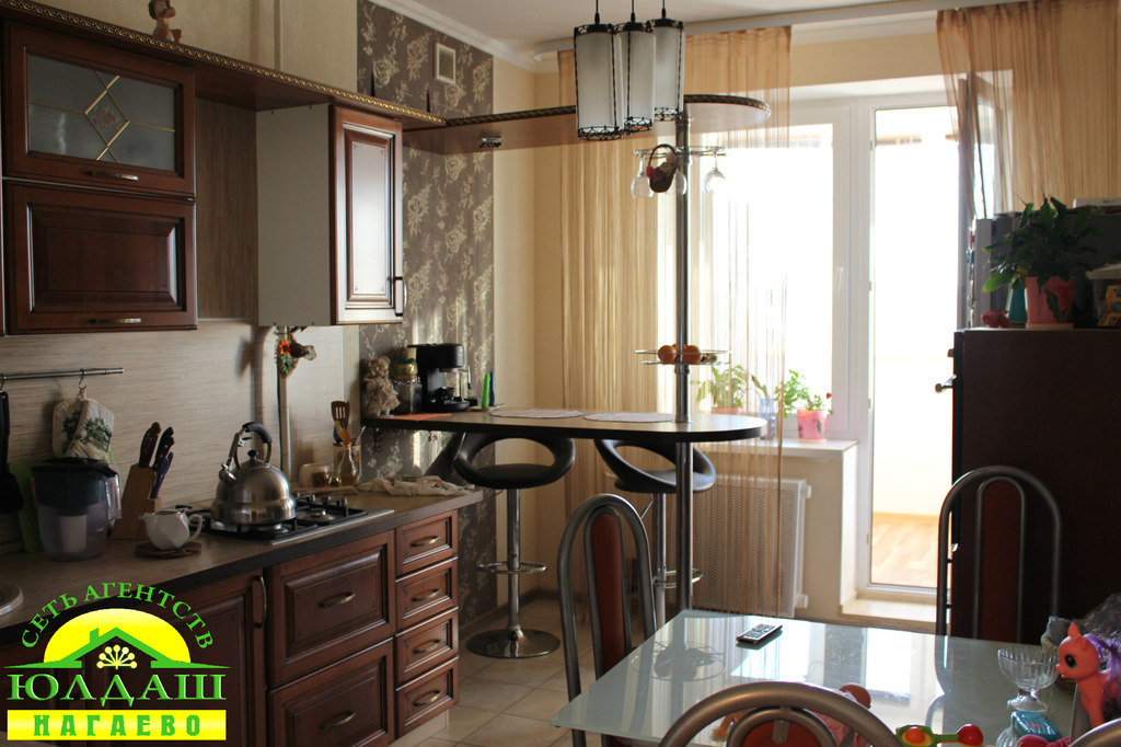Кухня - 11 кв.м. оборудована кухонным гарнитуром, есть барная стойка. Есть балкон (отделан, утеплен, система «теплый пол».