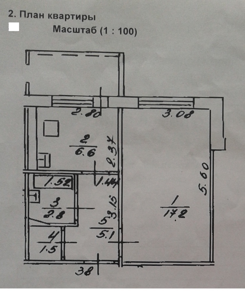 Общая площадь – 33,2 м2, жилая – 17,2 м2, кухня 6,6 м2.