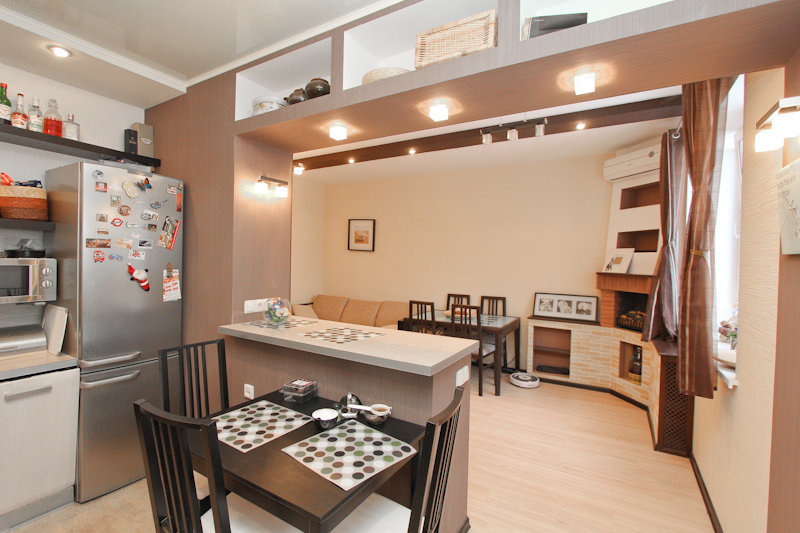 Натяжные потолки фирмы «BARRISOL», с точечным освещением и подвесными люстрами цвета антик.