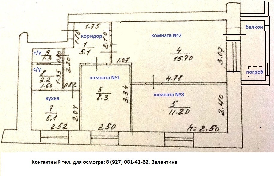 Продается 3-х комнатная квартира в г. Кумертау Республике Башкортостан по ул. Первомайской д.26 (центральный район) площадью 52,3 кв.м. от собственника стоимостью 1370 тыс. руб. без ремонта. Этаж 1/5, кирпичный дом (хрущёвка), квартира угловая. В наличии застекленный балкон с погребом, есть защитные решетки на окнах. С/у раздельный, 1 комната с отдельным входом (8,3 кв.м.), 2 смежные (15,7 и 11,2 кв.м.), (планировка на фото), высота потолков 2,5 м., состояние удовлетворительное - требуется косметический ремонт. В квартире газовая колонка (горячая вода). В собственности более 5-ти лет. Рядом из продуктовых магазинов магнит, пятерочка. Торг возможен только реальному покупателю. |