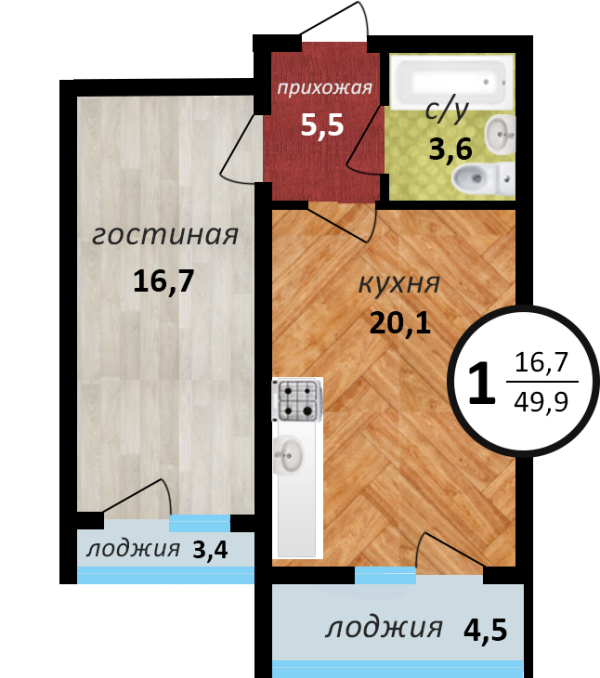 Квартира с отличной планировкой: кухня-столовая 20,1 кв.м. с выходом на лоджию и комната 16,7 кв.м.