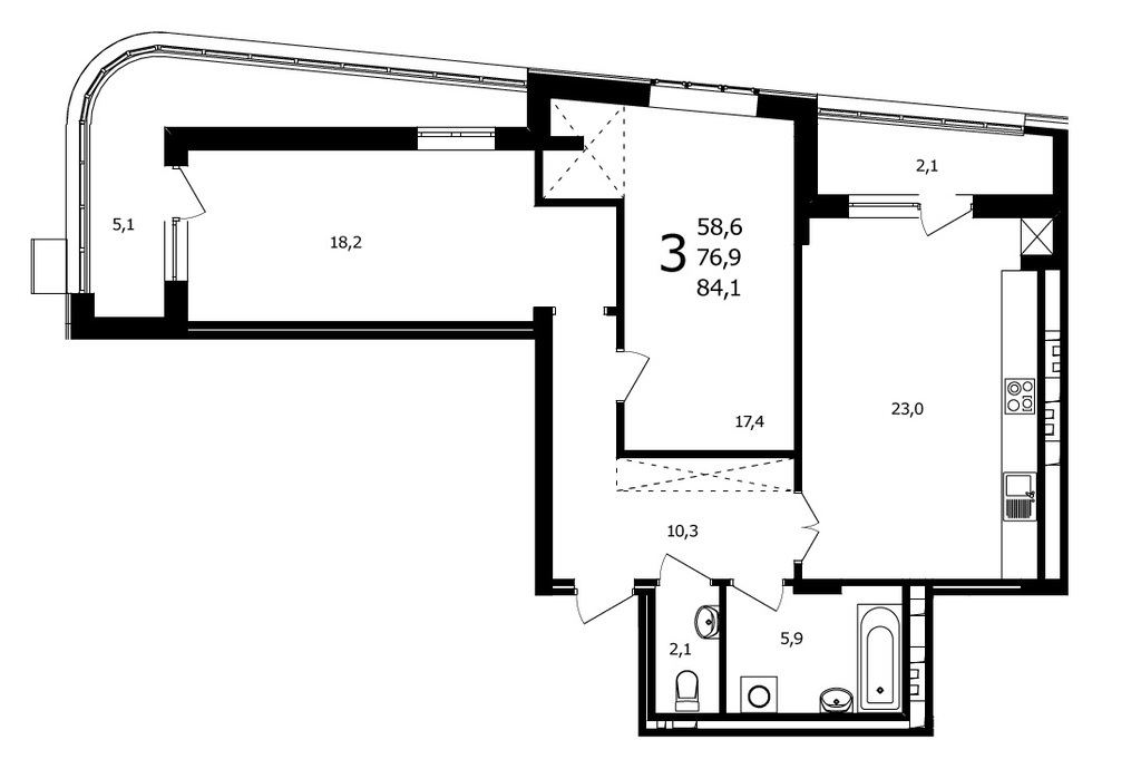 Площадь жилая: 58.6 м²