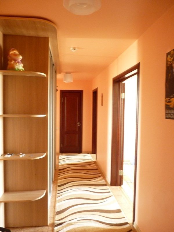Минуя санузел, попадаем на современную кухню. Площадь её 12.2 кв м. Полы на кухне выложены плиткой, на стенах декоративная штукатурка. Из кухни и всех других жилых комнат выход на ухоженные лоджии. Лоджии просторные и светлые, витражное остекление способствует дополнительному освещению.
