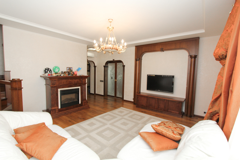 На 1 уровне просторная кухня площадью 21,2 кв. метра, на полу плитка (Мир ванных комнат, Италия), 2-х уровневый потолок с витражным освещением (Ирис). Большая гостиная 30,9 кв.м., спальня 22,2 кв.м, на полу дубовая доска (Германия), на стенах штукатурка. В прихожей керамогранит (Мир ванных комнат, Италия), на стенах камень и венецианская штукатурка; большая ванная комната 9,2 кв.м.- плитка, мебель для ванной и сантехника все производства Италия, Германия.