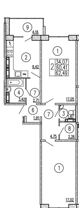 Квартира расположена на 9 этаже 17 этажного жилого дома, общей площадью 62,49 кв. м., жилая площадь 34,07 кв. м., кухня 9,5 кв. м. Лоджия с выходом из кухни.
