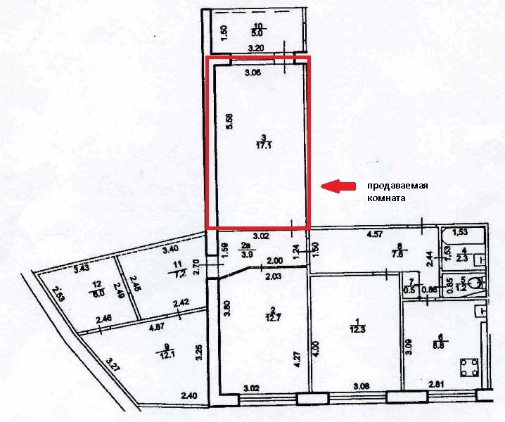 Продается комната 17,1 кв.м в трехкомнатной квартире общей площадью 88,0 кв. м в Калининском районе города Уфа по улице Георгия Мушникова, дом 9 (мкр. ИНОРС). Квартира малонаселенная, расположена на 6 этаже 9 этажного панельного дома 1989 года постройки. Квартира общей площадью 88,0 кв.м, площадь жилого помещения 66,8 кв.м, жилая площадь 42,1 кв.м, кухня 8,8, с/узел раздельный: туалет 1,2 кв.м, ванная комната 2,3 кв.м; общая лоджия 25,3 кв.м. Комната 17,1 кв.м, состояние комнаты хорошее: лоджия из комнаты 5 кв.м застеклена пластиковыми стеклопакетами, натяжной потолок с точечными светильниками, на полу качественный линолеум, новая входная дверь из натурального дерева. Состояние общих мест пользования среднее, новая металлическая входная дверь.