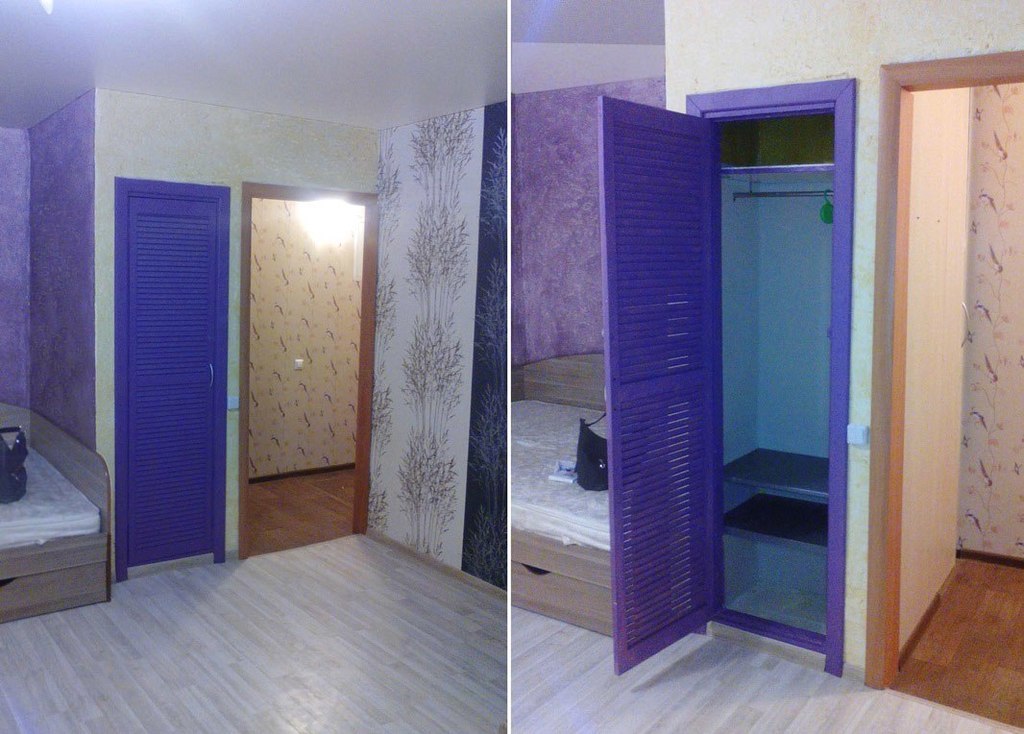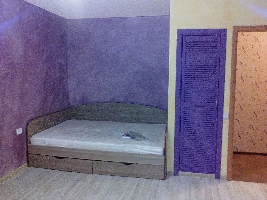 В зале: встроенный стенной шкаф-гардероб, встроенная в нишу широкая кровать с выдвижными ящиками для белья (при желании нишу легко можно отгородить, например ширмой или занавеской и зонировать пространство).