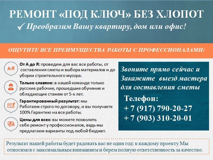 | Описание: | Ремонт под "ключ" без хлопот. Преобразим Вашу квартиру, дом или офис! Ощутите все преимущества работы с профессионалами: проведем для вас все работы, от составления сметы и выбора материалов, до выноса мусора! В нашей команде только русские рабочие, прошедшие обучение и обладающие стажем от 5-ти лет. Вы можете позволить себе ремонт у профессионалов, ведь мы предлагаем варианты под любой бюджет |