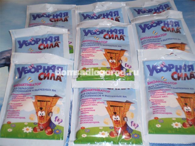 Активная работа микроорганизмов дает потрясающий эффект. Благодаря биосоставу Уборная Сила new, удается значительно сократить наполнение отстойного резервуара до 98 %. Сточные воды обеззараживаются и затем постепенно впитываются в почву через очищенное дно септика. Внесение порошка занимает несколько минут. После начала обработки туалетом, септиком и шамбо можно пользоваться в обычном режиме. Стоимость биопрепарата Уборная Сила new позволяет использовать его не только для очистки заполненных выгребных ям. Препарат очиститель является отличным средством для профилактического мероприятия, чтобы не доводить отстойник до засорения. Используйте био бактерии правильно Перед применением содержимое пакета смешивается в ведре с 10 л теплой воды, чтобы активировать деятельность микроорганизмов. Через 10 минут раствор заливается в обрабатываемый резервуар. Бактерии чувствительны к температурному режиму. Минимальная температура окружающей среды для качественной работы – +6С и выше. Это важно при использовании в открытых дачных, садовых, уличных и дворовых туалетах и выгребных ямах. В септиках, шамбо, тёплых туалетах и сливных колодцах биосептик модно использовать круглый год. Независимо, - 50С холода на улице или +45С жары. Преимущества очистителя Уборная Сила new Резюмируем достоинства антисептика: -Масса положительных отзывов от наших довольных клиентов; - Бюджетная цена; - 100% эффективность использования, даже в случаях, когда выгребная сливная яма вообще никогда не чистилась; - >:{o для экологии; - Простота применения; - >:{o для материалов канализационного сооружения; - Очистка стоков, переработка твердых фракций и нейтрализация запаха. Нужно очистить засор в септике или в дворовом туалете? Купите Уборную Силу new сейчас. И вы сможете быстро и эффективно самостоятельно решить проблему очистки сливной выгребной ямы в домашних и дачных условиях. Преимущества покупки биоактиватора в нашем интернет-магазине Советуем именно на нашем сайте купить оригинальный качественный очиститель септиков и выгребных ям Уборная Сила нью. Наша компания сотрудничает напрямую с эксклюзивным производителем средства - фирмой ООО Мегатериум г.Москва. Пользователь гарантированно защитит себя от покупки поддельного антисептика. Производитель постоянно предупреждает покупателей о нежелательном приобретении изделий их марки по всевозможным акциям, распродажам и скидкам. Покупка биопрепарата по заманчивой цене в различных интернет магазинах и торговых точках распродаж не гарантирует оригинал продукции. Чаще всего товары, продающиеся по скидкам и акциям, оказывается обычной дешёвой китайской подделкой. И такие очистители не дают эффективного результата чистки. Предлагаем купить фирменный биопрепарат Уборная Сила new в розницу и оптом. Организуем доставку Вашего заказа в любой населённый пункт РФ. Доставляем заказанный товар Транспортной Компанией Почтой России. Курьерской службой Оптовым покупателям предоставим скидку. Получить бесплатную консультацию по применению препарата вы можете, просто позвонив по телефону, указанному на сайте. На сайте нашего интернет-магазина купить биоактиватор можно удобным для вас способом: - позвонить по телефону, указанному на сайте; - добавив товар в режиме онлайн в вашу виртуальную корзину и затем заполнить форму